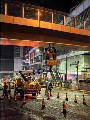 天橋位于商業區,天橋上下人流、車流量較大且天橋外側加裝了鋁板裝飾層,無形中為現場檢測工作帶了難度。為盡快完成本次檢測,同時減少現場檢測工作給游客及交通帶來的影響,本次檢測選擇在夜晚進行。我司組織了在檢測、鑒定領域具有豐富經驗的專家及檢測人員進駐現場,在最短時間完成了檢測方案編寫、天橋計算分析、交通占道方案審批、現場檢測工作準備以及橋梁外觀檢查、靜載和動載試驗以及欄桿推力試驗,圓滿完成檢測任務,為天橋結構的安全提供了有力的技術保障,為橋上打卡游客的人身安全保駕護航。