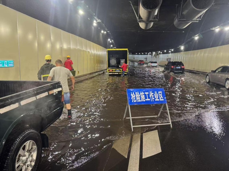 某區(qū)某隧道因地勢低洼且缺乏沉砂池,暴雨導致隧道中段嚴重積水,交通中斷。市建科院應(yīng)急隊伍火速趕赴現(xiàn)場,會同市政管網(wǎng)管理及設(shè)施維護單位,徹夜奮戰(zhàn),采取緊急排水措施,全力保障隧道通行安全及結(jié)構(gòu)穩(wěn)定。