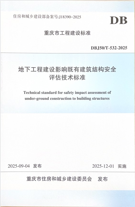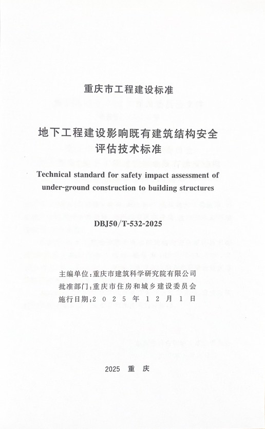 近日,由重慶設計集團所屬子企業重慶市建筑科學研究院有限公司(以下簡稱"市建科院")主編的《地下工程建設影響既有建筑結構安全評估技術標準》獲重慶市住房和城鄉建設委員會批準為重慶市工程建設地方標準,編號為(DBJ50/T-532-2025),將于2025年12月1日起實施。