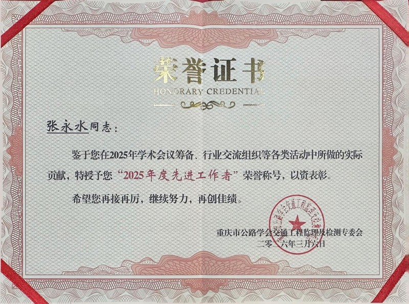 近日,重慶市公路學會交通工程監理及檢測專業委員會第四屆會員大會暨學術交流會成功舉行。會上,重慶設計集團市建科院所屬子企業重慶交大建設工程質量檢測中心有限公司被授予“2025年度優秀會員單位”稱號,公司技術總監張永水榮獲“2025年度先進工作者”榮譽稱號。